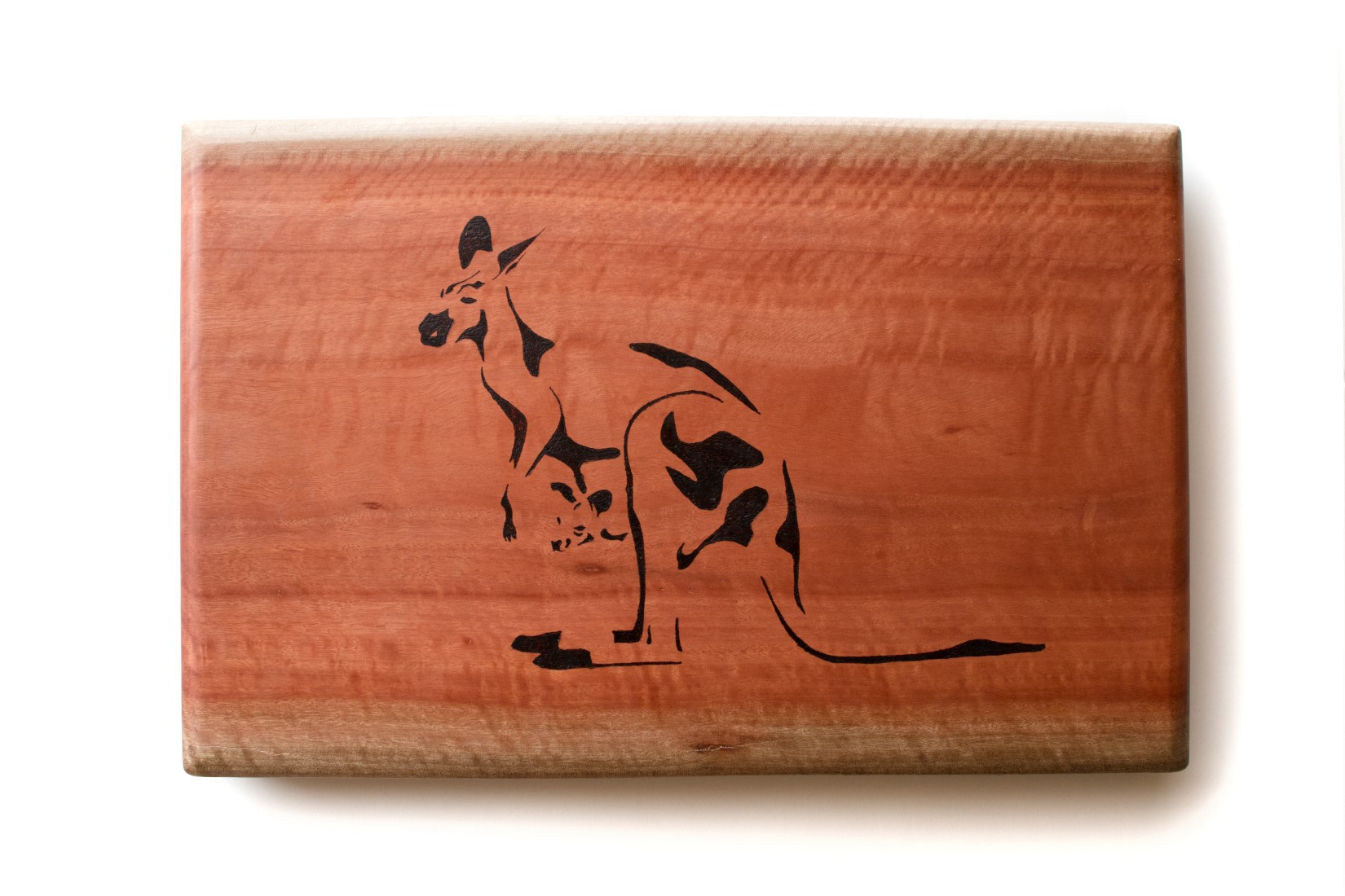 Collected sustainably from Harvey, Western Australia, this piece has been cut by hand, sanded to a smooth finish by hand, and has had a minimalist depiction of a kangaroo burnt into the wood on one side. This is a one of a kind piece.